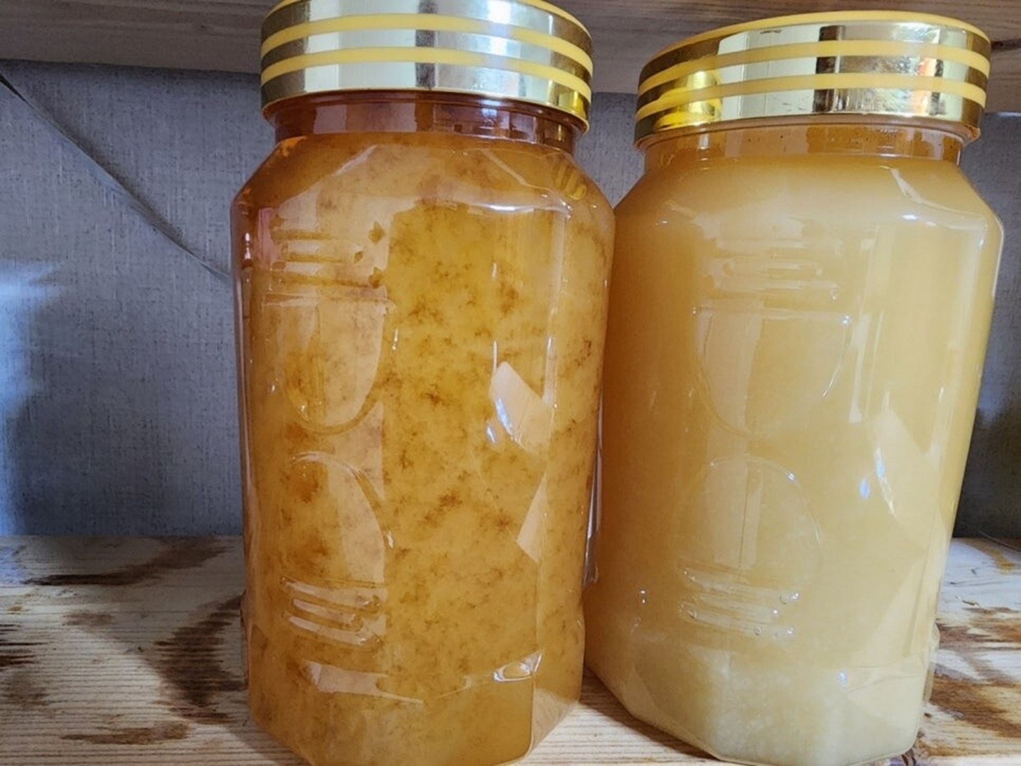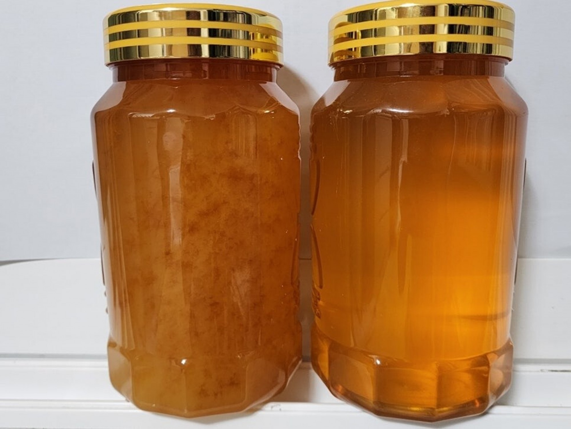 일반꿀은 결정이 느리게 진행 됩니다 (왼쪽 완숙꿀, 오른쪽 일반꿀)